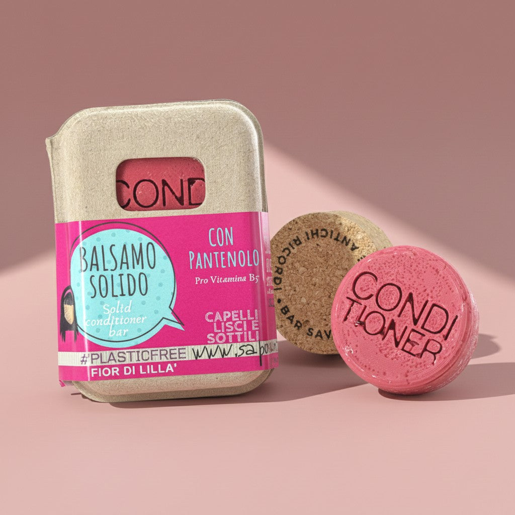 Après-shampoing solide Fior di Lillà, idéal pour les cheveux lisses et fins. À base de beurre de cacao, d'huile d'argan et de panthénol. Zéro déchet et incroyablement longue durée : jusqu'à 8 à 12 mois d'utilisation.